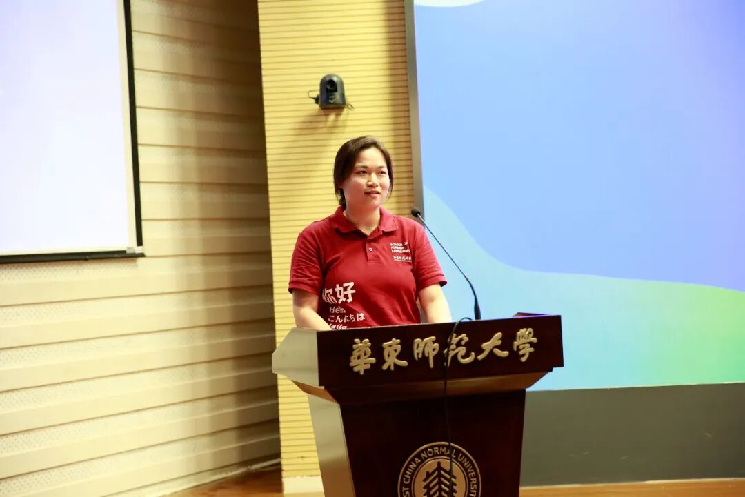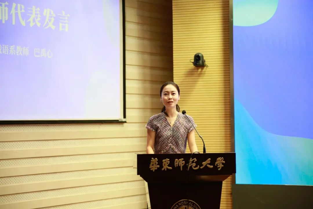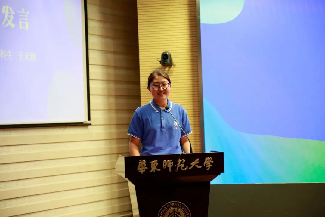 新生代表、英语师范专业本科生王未涵分享了从甘肃教师家庭走向华东师大的成长经历与教育梦想。在她看来,孟宪承书院与外语学院“破界协同”的联合培养模式已然为师范生搭建起跨学科成长的广阔平台。她号召师范生们以外语为眼,以技术为翼,以讲台为根,厚植教育情怀,承担新时代赋予师范生的使命,共同奏响时代的教育乐章。