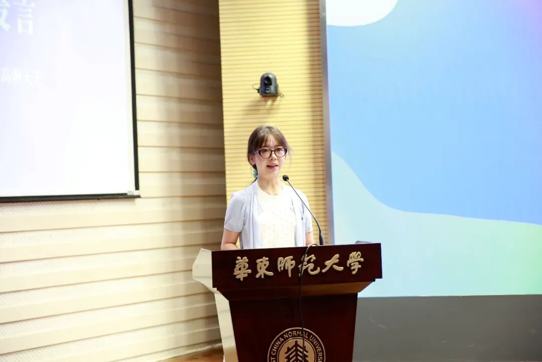 新生代表、英语语言文学专业博士研究生蒋梓文深情回顾了在华东师大硕士三年的美好时光,外语学院是一个鼓励尝试、温暖有爱的地方。她说,读博是源于一种“破界”的渴望,突破语言的界限,用多语能力打开新视界;突破文化的界限,用包容心态拥抱差异性;突破思维的界限,用跨学科视角理解世界。