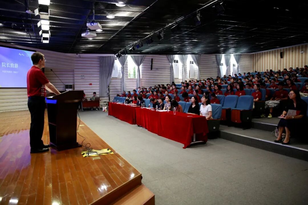外语学院院长杨延宁在致辞中结合自身经验,诠释外语人的“破界”精神。他勉励新生从“只专注一门语言技能”的心态,转变为“敢于尝试、愿意探索”的态度,主动突破自身边界和认知局限,勇于尝试新的领域。他强调,语言是推开世界之门、打开知识之窗的钥匙,学习语言的过程,本质上是理解世界多元思维方式与运行逻辑的过程,希望大家能够持续开阔思维、拓展知识边界,勇于突破自我,将专业知识与跨学科知识相融合,以所学外语为媒介,用全新的思维格局,创造属于自己的全新未来。