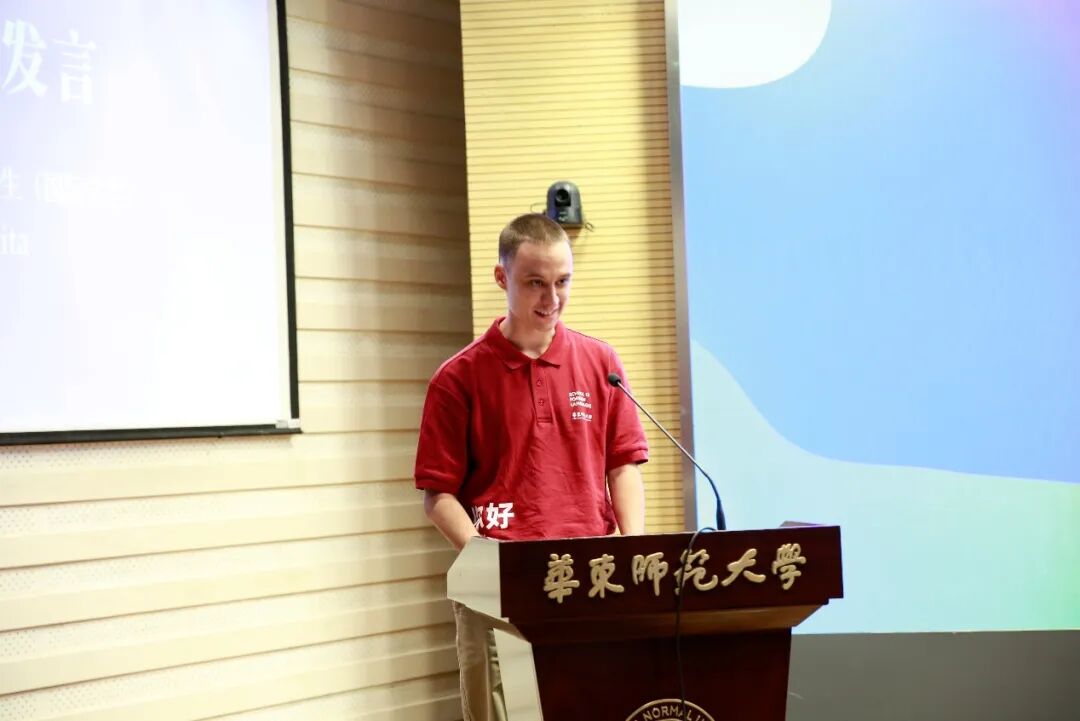 留学生新生代表、俄语笔译硕士研究生倪正哲(Nikita)分享了2022年以来多次参与学校线上及线下中文项目的经历,表达了对华东师大的深厚情感。他表示,将珍惜未来两年的学习时光,努力成为一名优秀的翻译者,以中文为桥梁,促进中俄交流与合作,为推动两国关系发展与和平事业贡献自己的力量。