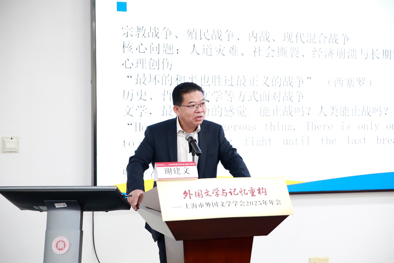 第一阶段的主旨报告由副会长、上海师范大学张静教授和华东师范大学胡学星教授主持。副会长、上海外国语大学谢建文教授以《另一个记忆的切口——马塞尔·拜尔<狐蝠>探析》为题,剖析了战争、记忆、声音与文学虚构之间的多重互动关系。谢建文教授认为,拜尔笔下的声音既是记忆的载体,也是重构历史的媒介,“声音档案”不仅再现了帝国末期德国生活轨迹的众声合唱,更在知识诗学的框架下,借助声学、解剖学等跨学科知识,构建了一个兼具身体性、反思性与象征性的叙事空间,最终在真实与虚构的张力中,展现了第三帝国历史记忆的面貌。