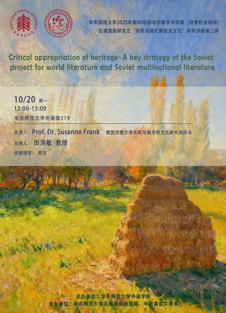 10月20日下午,华东师范大学”2025年第90场知名学者讲座“在外语学院319会议室举行,主讲人是苏珊·弗兰克教授、博士(Prof. Dr. Susanne Frank),来自德国洪堡大学东欧与匈牙利文化研究所,讲座题目为《批判性地适用文化遗产:苏联多民族文学发展与世界文学概念的界定与策略》,讲座由田洪敏教授主持,来自本校外语学院、中国语言文学系的老师与青年学子,以及上海师范大学中国语言文学系的博士生、本科生参加了本次的活动,并互动交流。